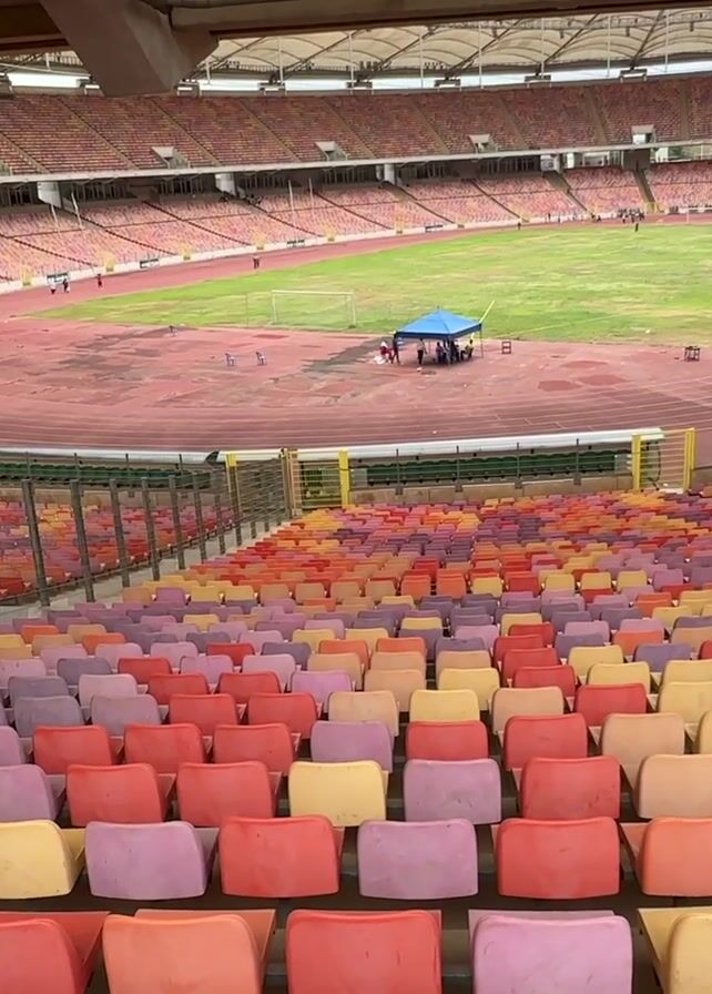 panoramic view of a large, mostly empty stadium. The stadium has a running track around a green field. The seating area is filled with colorful seats arranged in rows. There are people visible on the track and in the stands, though few in number. A blue tent is set up in the field. The structure of the stadium includes a roof providing partial shade.
