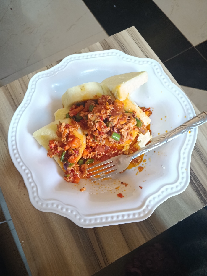 - "A white, scalloped-edge plate holds a meal consisting of light-yellow, cooked starchy pieces, possibly yam or potato, topped with a reddish-orange scrambled egg stew containing chopped red and green vegetables" by FM-oitC43, licensed under CC BY 4.0