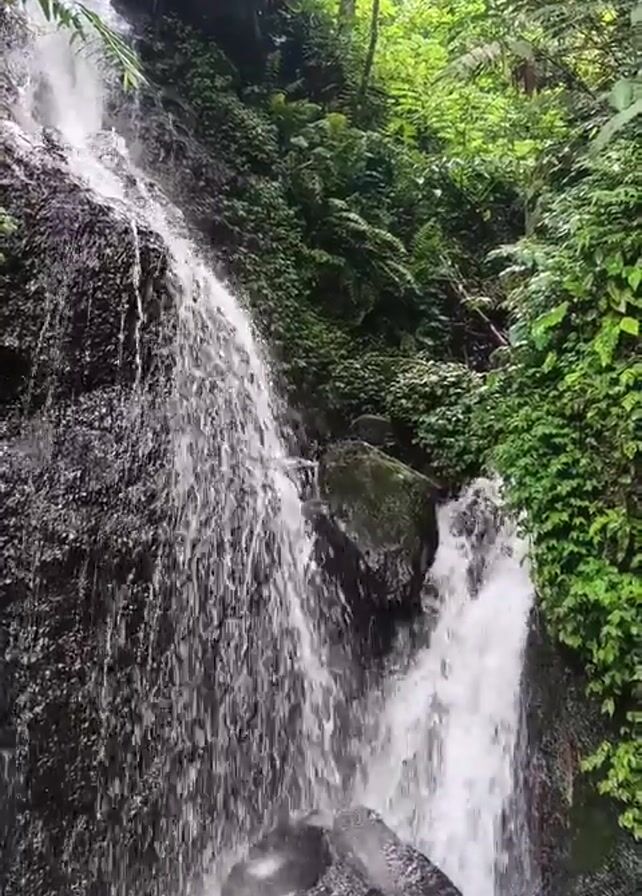 multi-tiered waterfall cascading down a rocky, moss-covered cliff face into a small pool. Lush green foliage, including ferns and vines, covers the surrounding area. The water appears clear and abundant. A large rock is visible at the base of the waterfall. The sound of rushing water is audible.