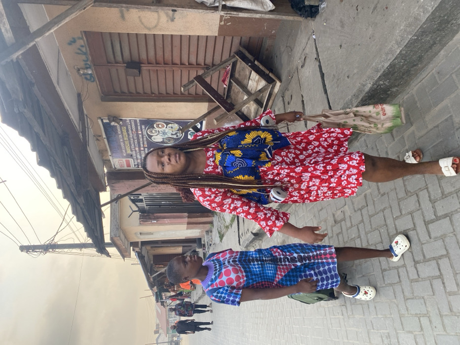 Two women stand on a paved sidewalk in front of shops. The woman in the foreground wears a red floral dress with a blue, yellow, and black patterned bib, and white sandals. She carries a plastic shopping bag. The woman behind her wears a blue, red, and white patterned dress and white clogs. People walk in the background. The shops appear closed, with wooden doors and signs. Overhanging structures are visible. The sky is overcast.