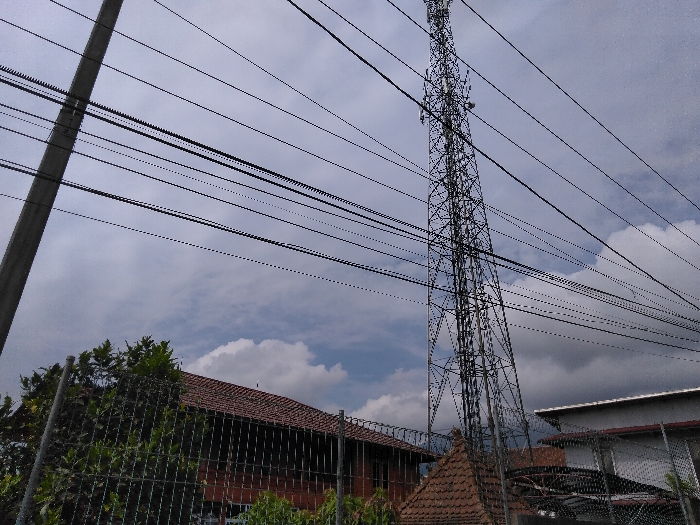 This image depicts an urban or semi-urban scene in Phou Khoun, Laos, dominated by utility infrastructure under a partly cloudy sky. A tall, grey, lattice-style telecommunications tower equipped with multiple antennas and dishes stands prominently on the right side of the frame, extending from the lower-mid ground towards the top. Numerous black overhead utility lines and cables crisscross the upper portion of the image, running diagonally across the sky and converging towards the tower. A grey utility pole is visible on the far left, supporting some of these lines. Below the utility lines and the tower, several buildings are partially visible. On the left, a structure with a red-tiled roof and dark walls is mostly obscured by green foliage and a dark metal mesh fence that appears to have barbed wire elements at its top. To the right of this, another building features a light-colored roof and white or light-grey facades, with dark rectangular openings possibly indicating windows or vents. A smaller, brown-tiled roof peaks in the foreground, near the base of the tower. No individuals or active interactions are visible in the scene. The sky above is a mix of pale blue and various shades of white and grey clouds, suggesting an overcast but not entirely stormy condition.