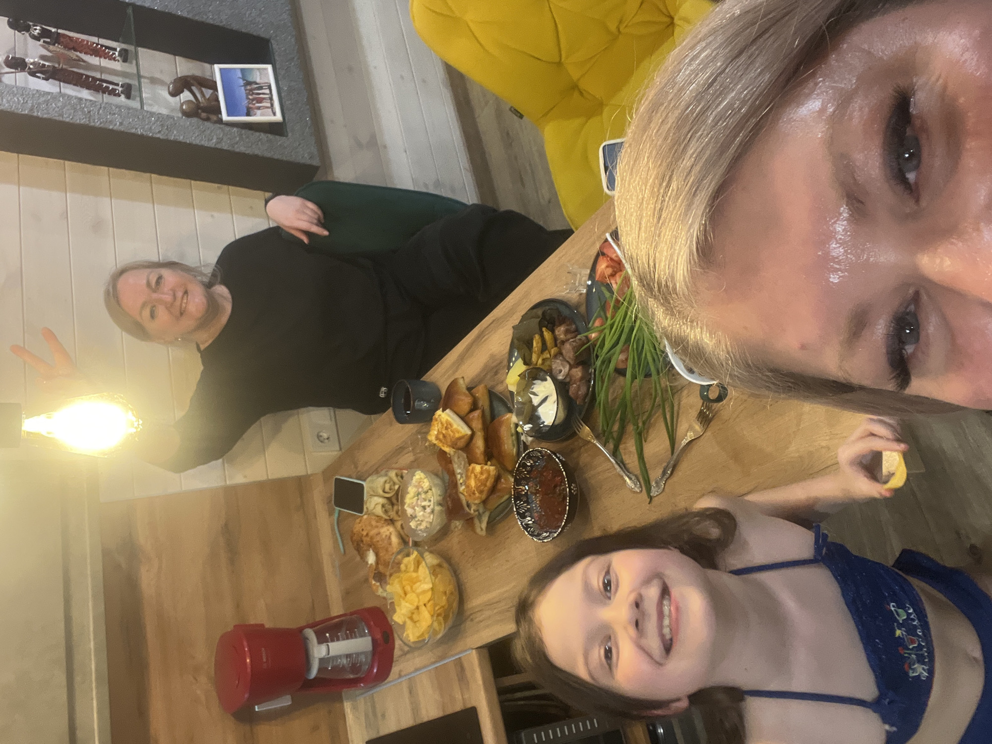 family gathering around a wooden table laden with food. A woman in a black sweater makes a peace sign. A young girl in a blue swimsuit smiles for the selfie. A woman with blonde hair is taking the photo. The table has a variety of dishes, including chips, salad, fried items, sauces, and green onions. In the background, there is a yellow chair and a dark gray shelf with decorative items. A red kitchen appliance is on the table edge. The location is likely a home in Новая Чернушка, Russia.