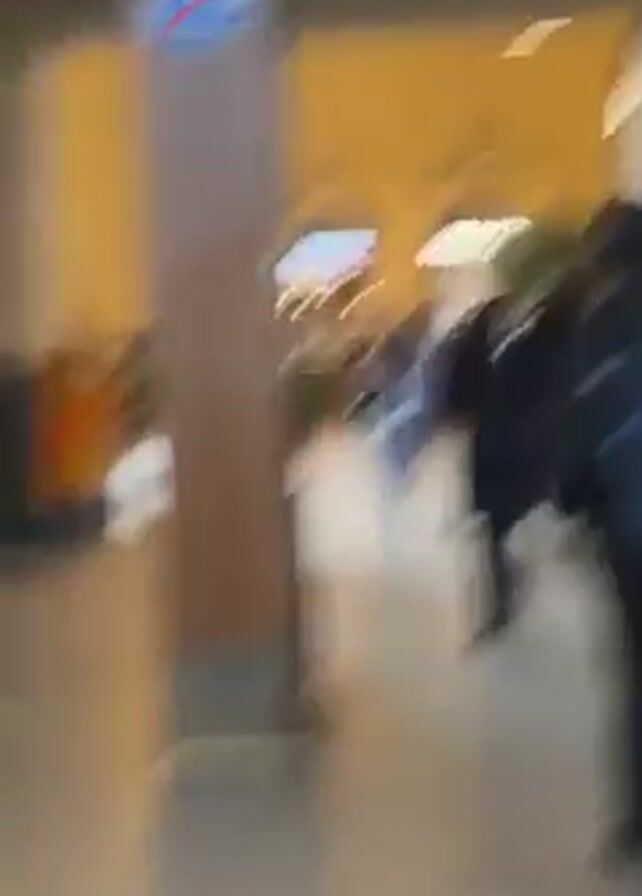 n interior shot of what appears to be a transit station or airport. People are walking through a corridor with tan tiled floors and yellow walls, while a sign that is partially obscured by light reads, "Kombinier Bewegings." A closed Starbucks is visible on the right.