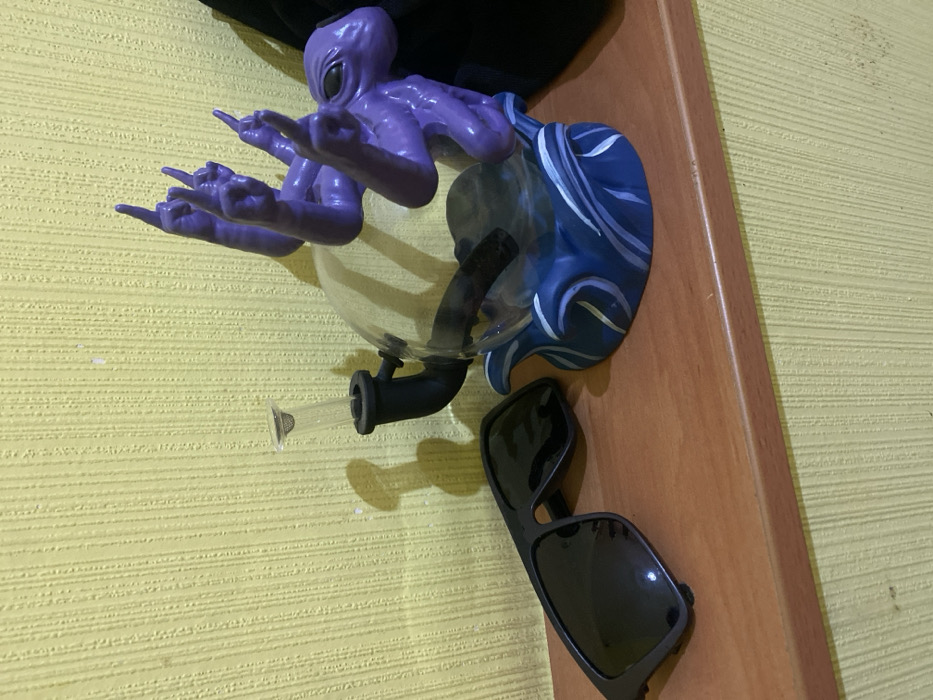 The image displays an indoor scene in Krasnodar, Russia, featuring objects arranged on a light brown wooden shelf with a reddish-brown laminated edge. The background is a light yellow, vertically textured wallpaper exhibiting minor dark scuff marks. On the left side of the shelf, a pair of matte black, plastic-framed sunglasses with dark lenses rests. The left temple arm of the sunglasses is folded. To the right, a distinctive water pipe is positioned. This item consists of a clear spherical glass chamber supported by a dark blue base with painted light blue and white wave patterns. A glossy purple, multi-limbed, alien-like figure with prominent black eyes is integrated into the upper portion of the glass sphere. Several of the figure's arms extend upwards, each forming a two-fingered 'rock 'n' roll' or 'devil horns' gesture. A black downstem extends from the side of the glass chamber, into which a clear glass bowl containing a circular silver mesh screen is inserted. A black fabric or bag object is partially visible behind the water pipe on the far right. The scene is lit, casting soft shadows of the objects onto the wall.