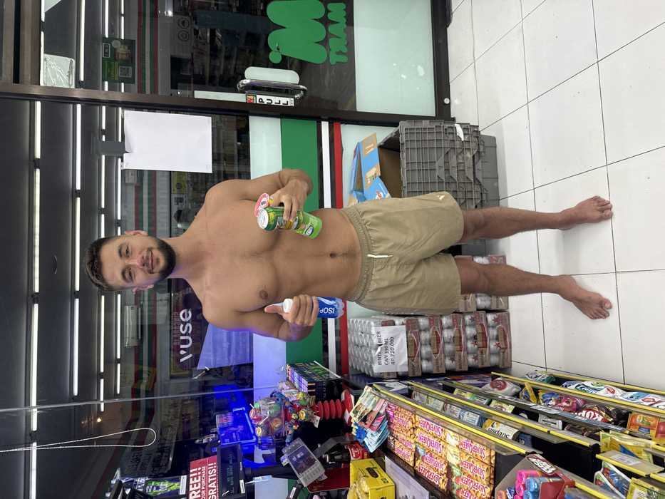 A shirtless male, appearing to be in his late 20s or early 30s with short brown hair and stubble, stands barefoot on a white tiled floor inside a convenience store located in Tibubeneng, Indonesia