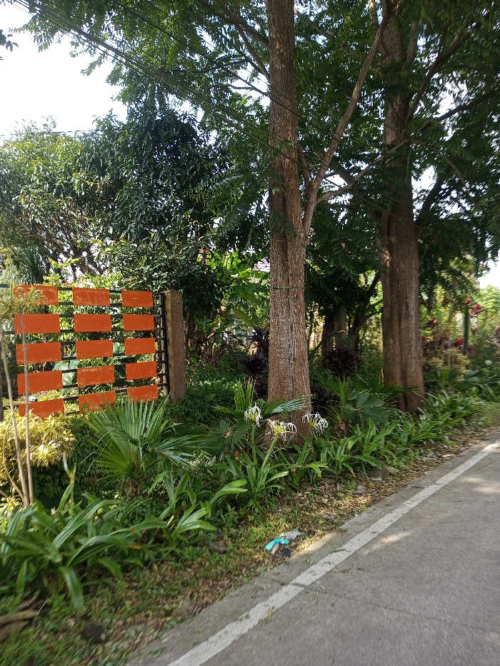 A roadside view captures lush greenery with tall trees and various plants. An orange trellis fence stands at the edge of the foliage. The ground is covered with grass and assorted plants, including lilies with spidery petals. A paved road with a painted white line runs alongside the plants. The scene is bathed in daylight.
