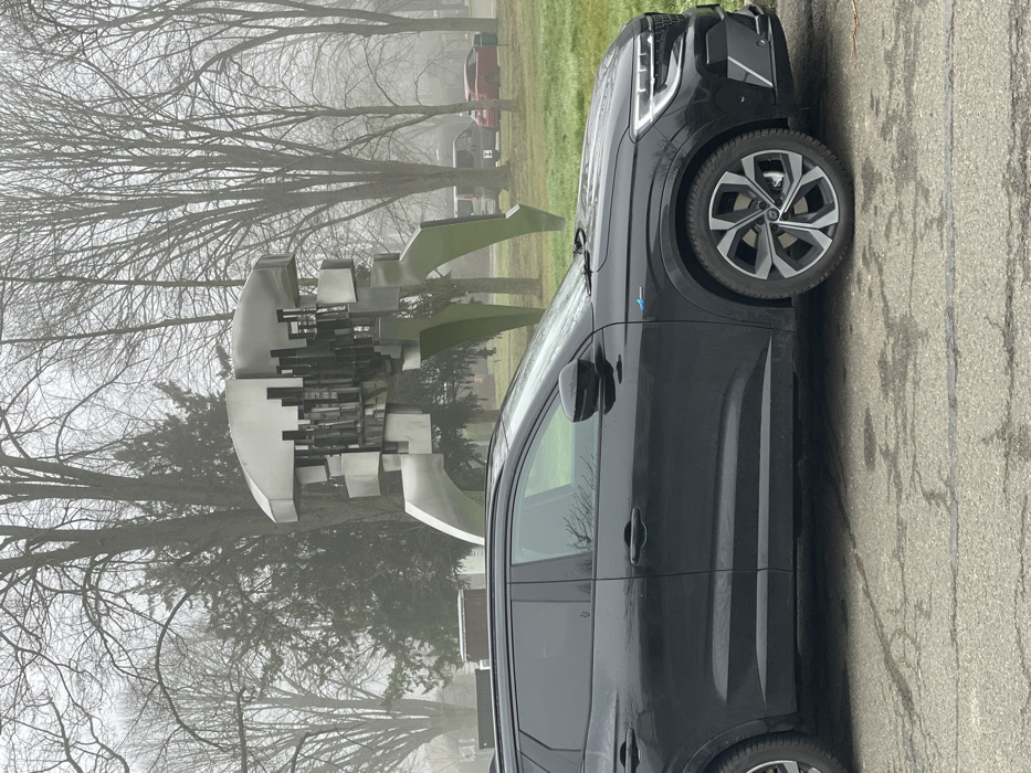 The image presents a static, exterior scene on an overcast and misty day in Montigny-le-Bretonneux, France, specifically capturing the area near the Gare de Saint-Quentin-en-Yvelines. In the foreground, a dark-colored, four-door SUV, identified as a Renault Austral E-Tech, is parked on a cracked and damp asphalt surface. The vehicle is oriented with its front section towards the right, displaying its front right multi-spoke alloy wheel, fender with a blue "E-Tech" badge, side mirror, and the driver's side and rear passenger doors, which feature tinted windows. The mid-ground is dominated by a large, abstract metallic sculpture known as "Le Signal" by Jean-Bernard Métais, situated on a grassy area. The sculpture is constructed from reflective silver-colored panels and numerous darker, rectangular elements, forming a geometric structure with prominent angular supports or legs grounding it. Its upper section features a series of vertical dark bars. Beyond the sculpture and the grassy expanse, the background consists of numerous bare deciduous trees and scattered evergreen conifers, partially obscured by the pervasive mist, indicating a late autumn or winter season. Further in the distance, through the atmospheric haze and foliage, outlines of several parked vehicles are discernible, including a light-colored van, a darker van, and a red passenger car on what appears to be a paved lot or road. No individuals are visible, and no actions or interactions are depicted within the frame. The scene is characterized by its muted colors and diffused natural light.