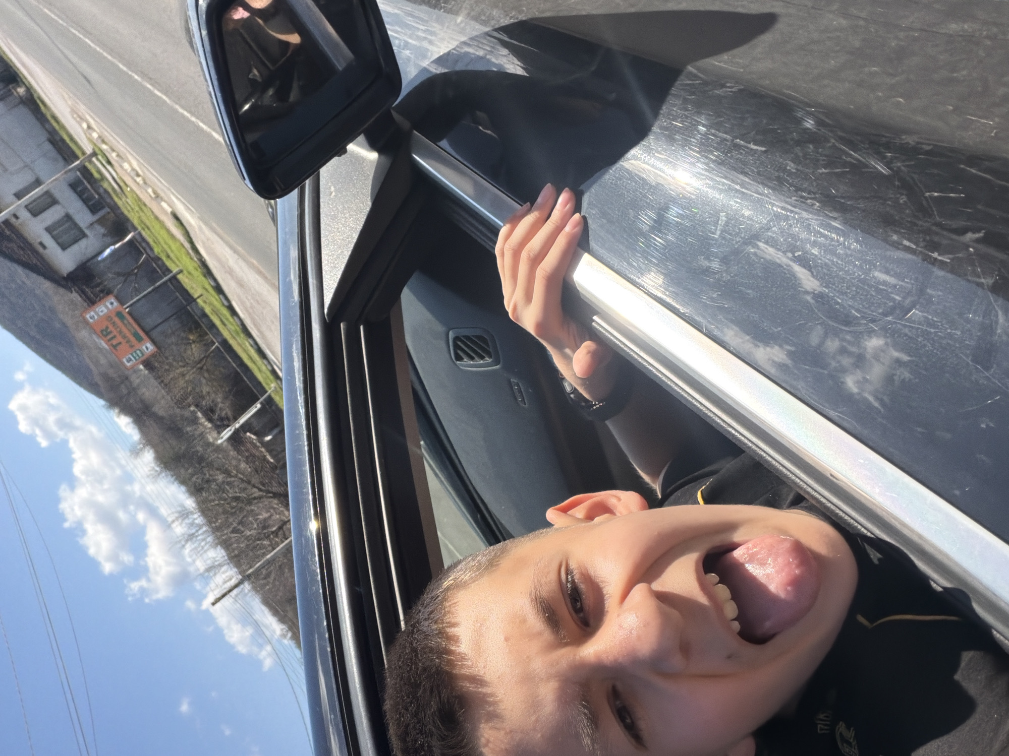 A young person is sticking their tongue out of a car window