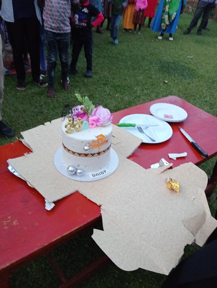 A white cake, decorated with a pink flower, greenery, and a gold "2023" topper, sits on a cardboard platform on a red table. The name "Daisy" is on the cake's base. Plates, cutlery, and a knife are also on the table. A partially unwrapped chocolate candy lies on the cardboard. Several people stand on the grass in the background.