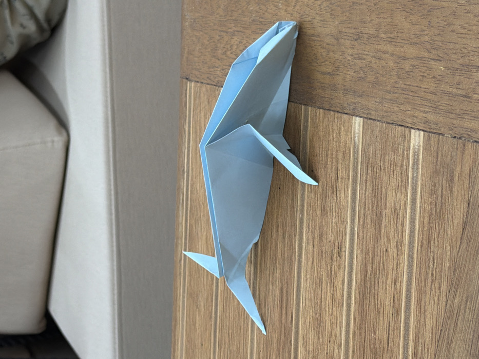 - "A light blue origami whale model is depicted resting on a textured, medium-brown wooden surface within an indoor environment in Maafushi, Maldives" by FM-RjPGA3, licensed under CC BY 4.0