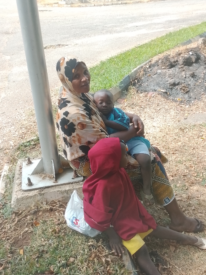 An adult female and two young children are seated on dry ground next to a roadside in Gwarinpa, Nigeria