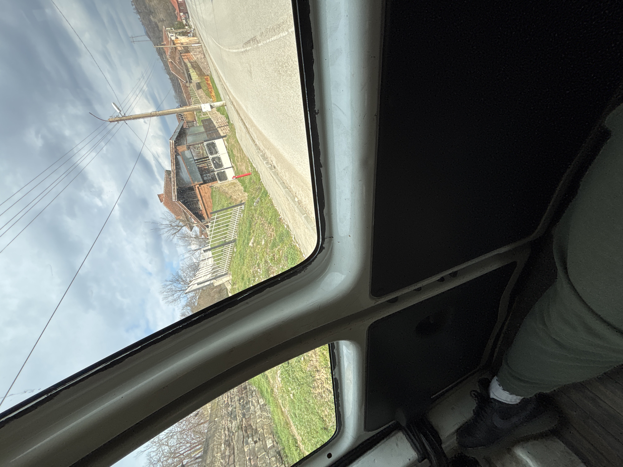 The scene is viewed from inside a vehicle, through a side window. In the lower left foreground, a person's leg is visible, clad in dark green sweatpants, white socks, and a dark athletic shoe. The vehicle's interior shows a white window frame and dark paneling. Outside, an overcast sky with grey and lighter cloud formations is overhead. An asphalt road curves to the right, bordered by a concrete sidewalk. Adjacent to the sidewalk stands a multi-level building featuring a red-tiled roof, a brick upper facade, and a lower section constructed of mixed materials with prominent white gates. A red fire hydrant is positioned on the sidewalk directly in front of these gates. A wooden utility pole, supporting a street light and multiple overhead power lines, is situated roadside. To the left, a grassy incline displays a stone wall structure and bare deciduous trees, indicative of late winter or early spring. Additional residential buildings and utility infrastructure are visible on distant hillsides. This scene is located in Slatina, Bulgaria.