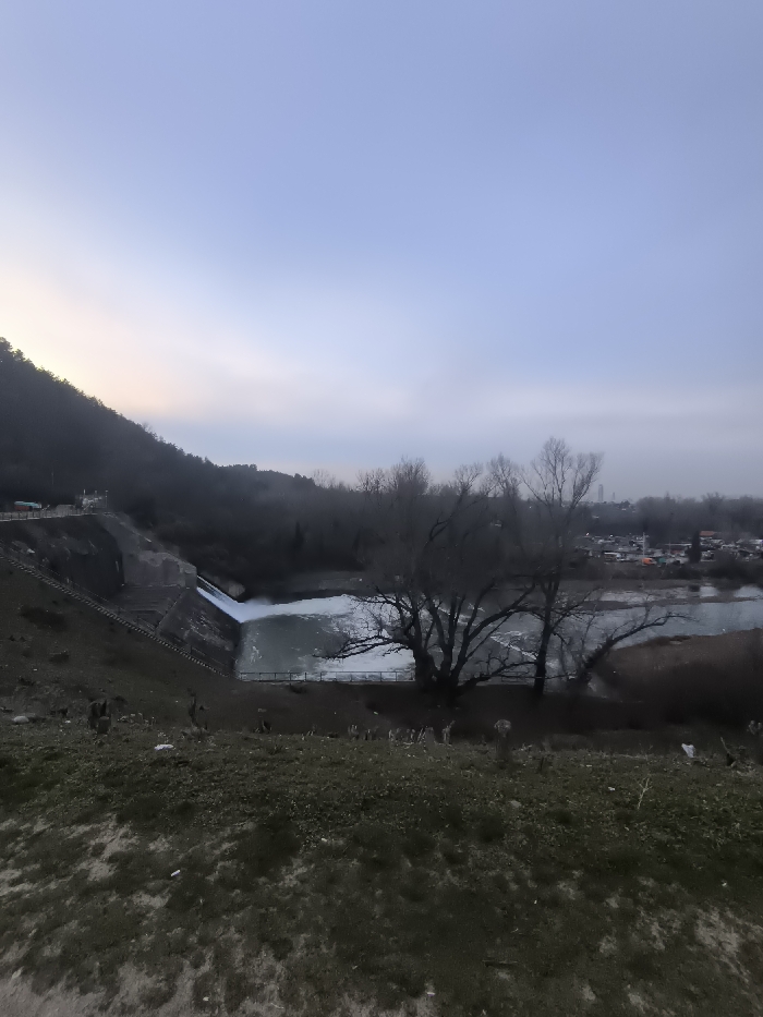 The image captures an outdoor scene in Pancharevo, Bulgaria, under diffused light conditions consistent with twilight or an overcast day. The vantage point is elevated, overlooking a section of Pancharevo Lake and its dam. The foreground consists of an uneven, dark green and brown grassy slope with sparse vegetation. Beyond this, a concrete dam structure is visible on the left, featuring a spillway from which a volume of white, turbulent water cascades into the water body below. A set of dark, linear rails or steps are present on the sloped embankment immediately to the left of the dam. The central and right midground features a wide expanse of water, appearing partially frozen or covered in light ice and foam, particularly near the dam's outflow. A line of large, bare deciduous trees with dark, intricate branch structures stands along the water's edge, primarily on the right side of the frame. A dark fence runs along the immediate bank. To the far left, a dark, densely forested hillside rises sharply. In the distant background, beyond the water and trees on the right, a cluster of residential or industrial buildings with varying rooflines and a tall, slender dark structure (possibly a tower) are faintly visible. The sky occupies the upper half of the image, displaying a gradient from light blue-grey on the left to a slightly darker blue-grey on the right, with no direct sun visible.