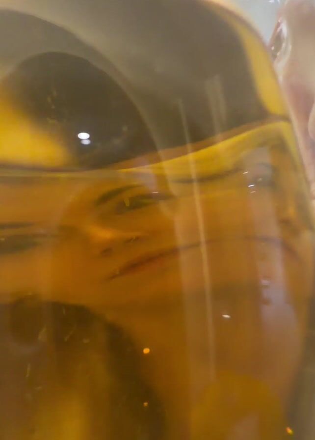 A clear glass jar is filled with an amber liquid. The video shows a person's face, distorted and reflected through the jar and liquid. The person makes several facial expressions. The background is blurred, but appears to be a light-colored interior.