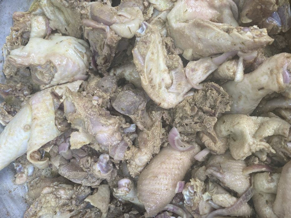 The image displays a close-up, overhead view of numerous pieces of raw or partially cooked poultry and various meat cuts contained within a large metallic cooking vessel