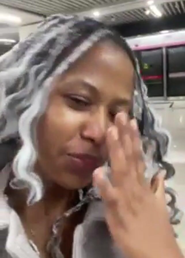 A woman faces the camera in an indoor setting. She has medium skin tone, with black and white braided hair. She is wearing a gray zip-up sweater. The background features a white, striped ceiling, with a portion of a bus visible behind her. She waves once, then holds her hand up closer to the camera.