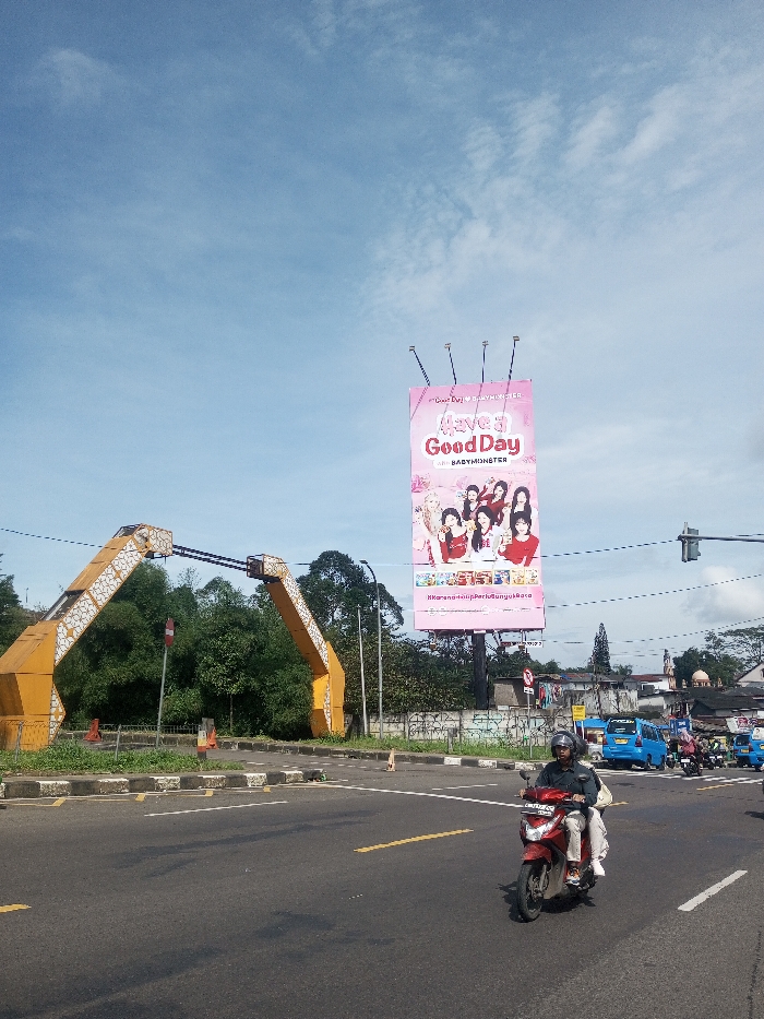 A street scene features a large pink billboard advertising "Have a Good Day" by BABYMONSTER. Next to it is a yellow archway structure. Cars and motorcycles are on the road. The sky is blue with some clouds. Green foliage is in the background. There's also a traffic light.
