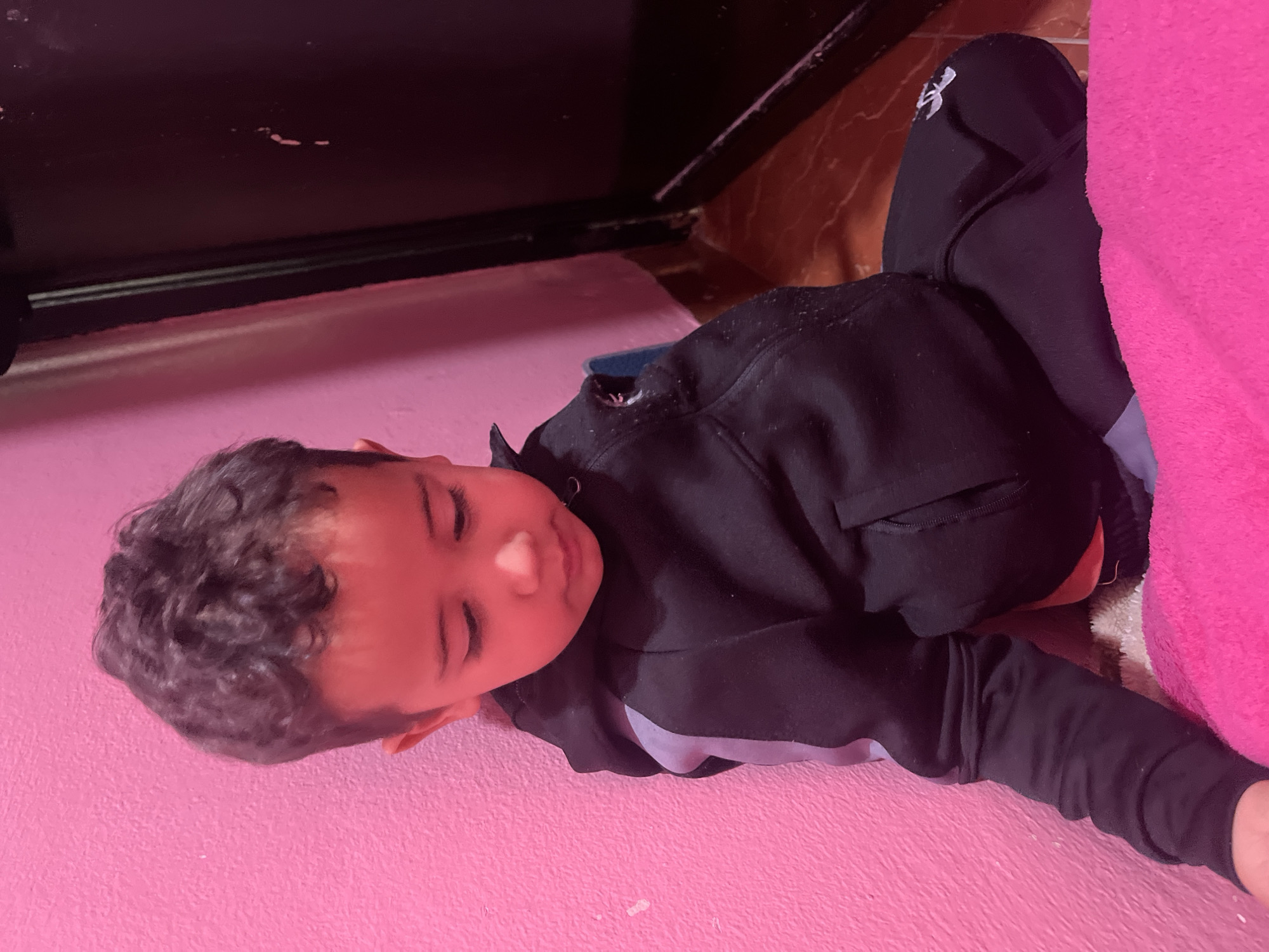 A child is lying on a pink surface, potentially a bed or floor. The child has dark, curly hair and is wearing a black hooded sweatshirt. Part of their lower body is clad in black pants. A pink blanket is visible on the right side of the image. A dark object, possibly furniture, is in the upper left corner. A red marble floor is visible in the background. No definitive indications of Ouaouizert, Morocco, are visible in the image.