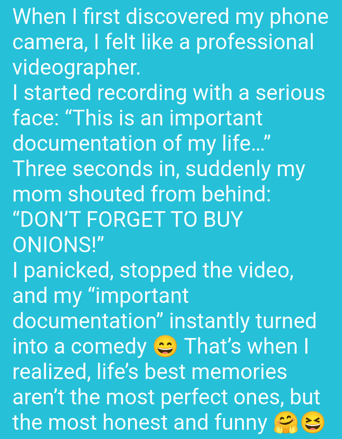 The image displays white text against a solid cyan background, recounting a personal anecdote. Two yellow smiling face emojis and one yellow laughing face emoji are interspersed within the final sentence of the text. The narrated scene, contextually situated in the city of Pie, Indonesia, describes an individual's attempt to record a serious "documentation of my life" using a newly discovered phone camera. Approximately three seconds into this recording, the individual's mother, from an unspecified proximate location (implied to be within a domestic environment), audibly interjects with the instruction: "DON'T FORGET TO BUY ONIONS!" This vocal interaction causes the recording individual to cease their video, altering the perceived serious nature of the initial activity into a comedic memory. The primary subjects are the narrator (operating a phone camera, the object in use) and their mother (performing the action of shouting an instruction). The interaction involves an interruption of a personal recording by a domestic chore reminder. The immediate environment of the recording itself is not visually depicted, but the interaction suggests a home setting.