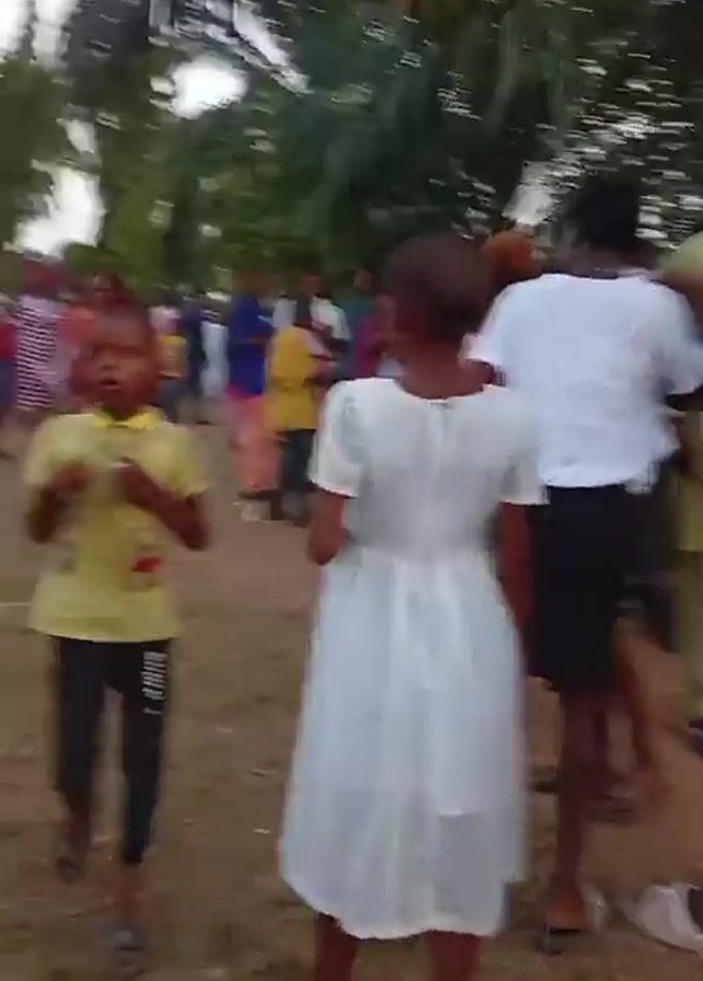 The video depicts a gathering of people, mostly children, in an outdoor setting. Many are dressed in bright, varied colors, including yellow, red, orange, and patterned fabrics. The scene is slightly blurry, suggesting movement and a handheld camera. There are trees and a clear sky in the background, suggesting the event is taking place during daylight hours. The children appear to be walking and interacting with each other, indicating a possible event or celebration. There is also a building or structure visible in the distance, as well as what appears to be a soccer goal.