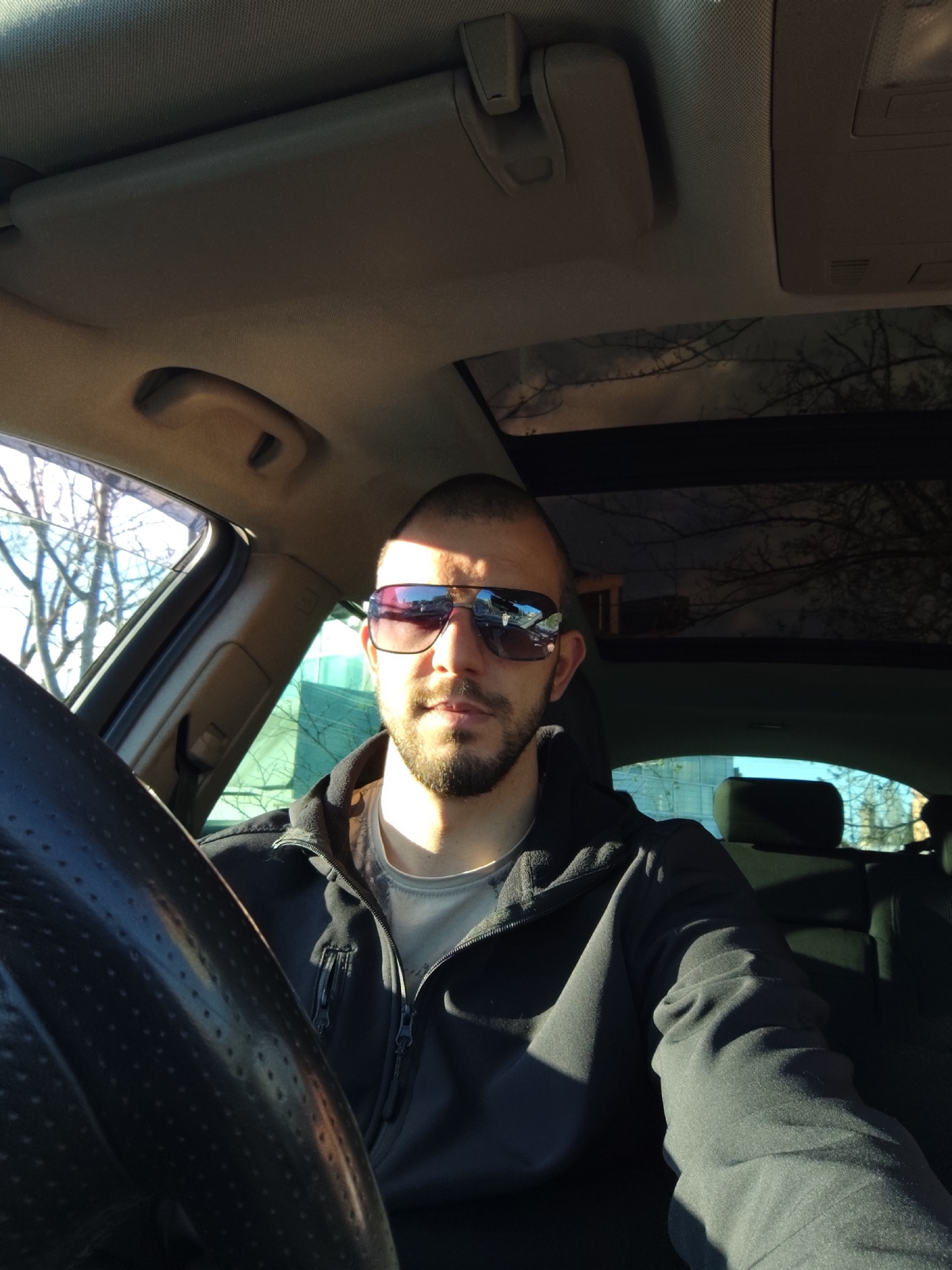 A man is driving a car. He has short dark hair, a beard, and sunglasses. He is wearing a black jacket over a gray shirt. The car has a black steering wheel and a sunroof. Trees are visible through the car windows, which is indicative of an outdoor location. It is daytime and sunny. There is no identifiable information to indicate the location is Stara Zagora, Bulgaria.