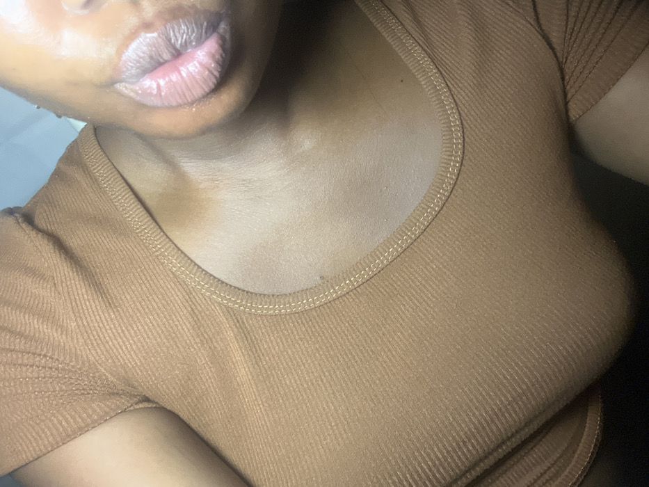 An up-close shot features a person's upper torso, including part of their face. The focus is on their lips, which appear glossy and full. The person wears a tan-colored, ribbed knit top with a rounded neckline. The skin tone is smooth and appears well-moisturized. The lighting highlights the textures of both the fabric and the skin. The composition is intimate, emphasizing the facial features and clothing details.