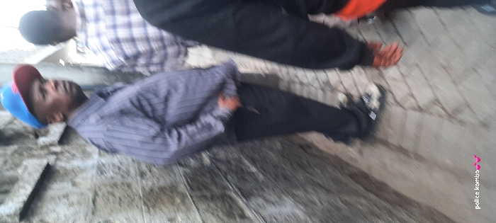 Two men are lying on a patterned stone or concrete surface. One man is wearing a blue and red baseball cap, a gray striped shirt, and black pants. The other man is wearing a plaid shirt and black pants. Only the legs and feet of the second man are visible. The image is blurry.