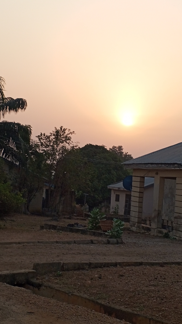 A tranquil scene unfolds under a golden sky, with the sun softly veiled. Simple buildings with metal roofs nestle among trees, including a palm. The foreground features layered concrete and dirt textures, hinting at structured landscaping. The entire picture is bathed in warm, muted tones.