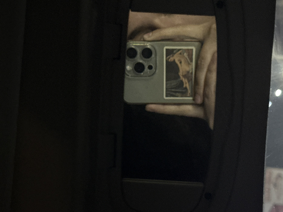A person's hand holds a smartphone within a dark space. The phone is a light grey color with three rear-facing camera lenses. A small rectangular sticker adorns the back of the phone, featuring a classical painting depicting a nude male figure. The surrounding area is primarily dark, defined by the frame of an opening or compartment. A small light is visible in the background to the right.