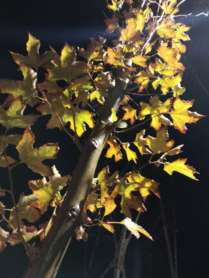 A nighttime shot focuses on a tree with large, maple-like leaves displaying vibrant yellow and brown hues