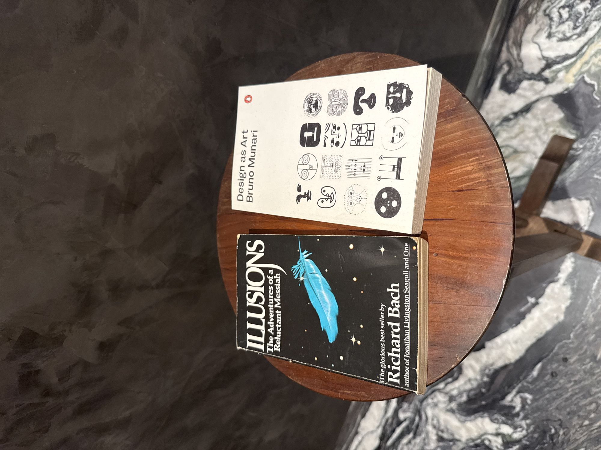 two books stacked on a small round wooden table. The top book is titled "Design as Art" by Bruno Munari. The bottom book is titled "Illusions: The Adventures of a Reluctant Messiah" by Richard Bach. The table is positioned between a wall with a textured, dark gray finish and a patterned object that could be marble, though the location and city are not identifiable within the image.