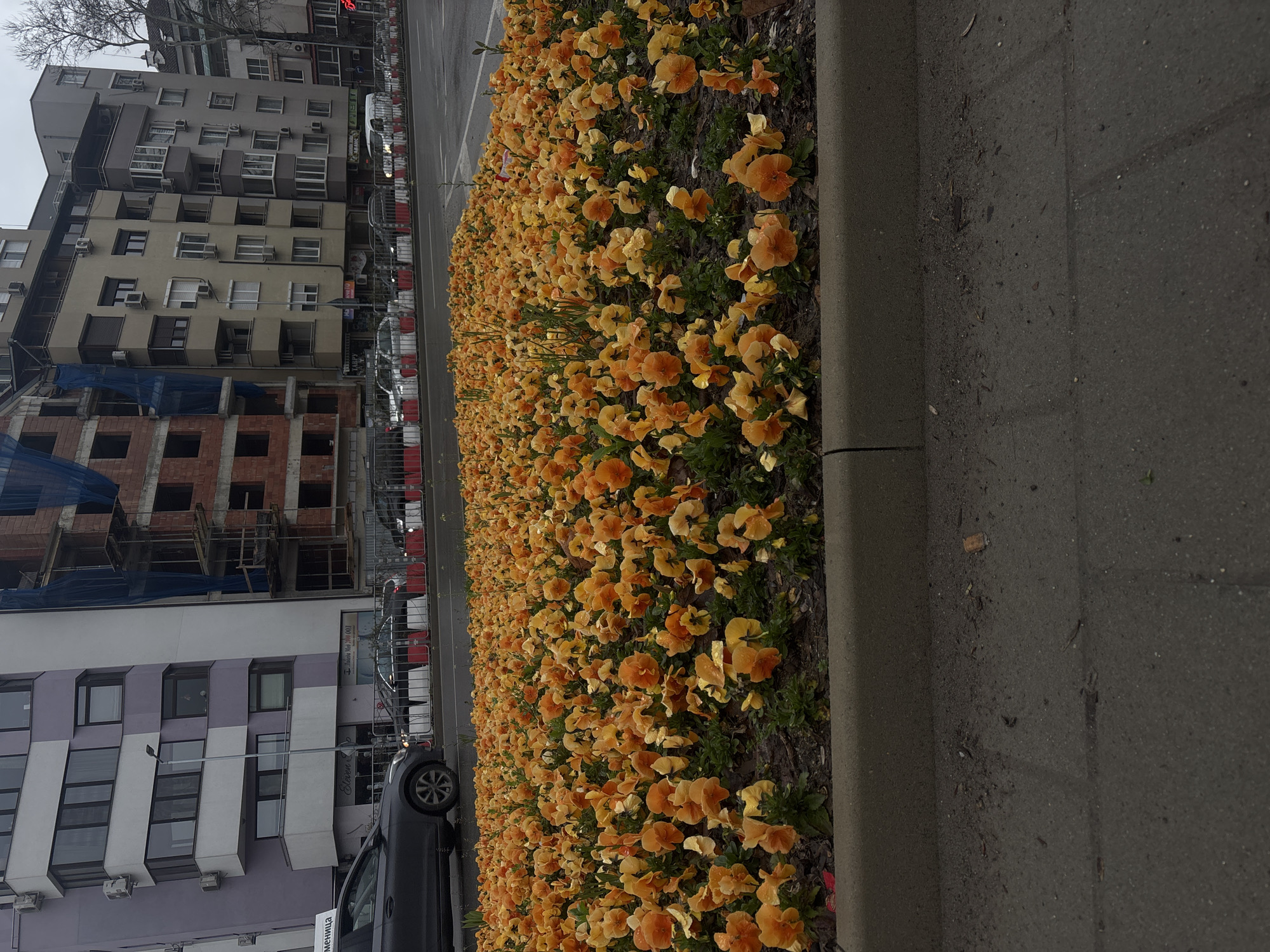 The image depicts a flower bed of orange pansies lining a street in Plovdiv, Bulgaria
