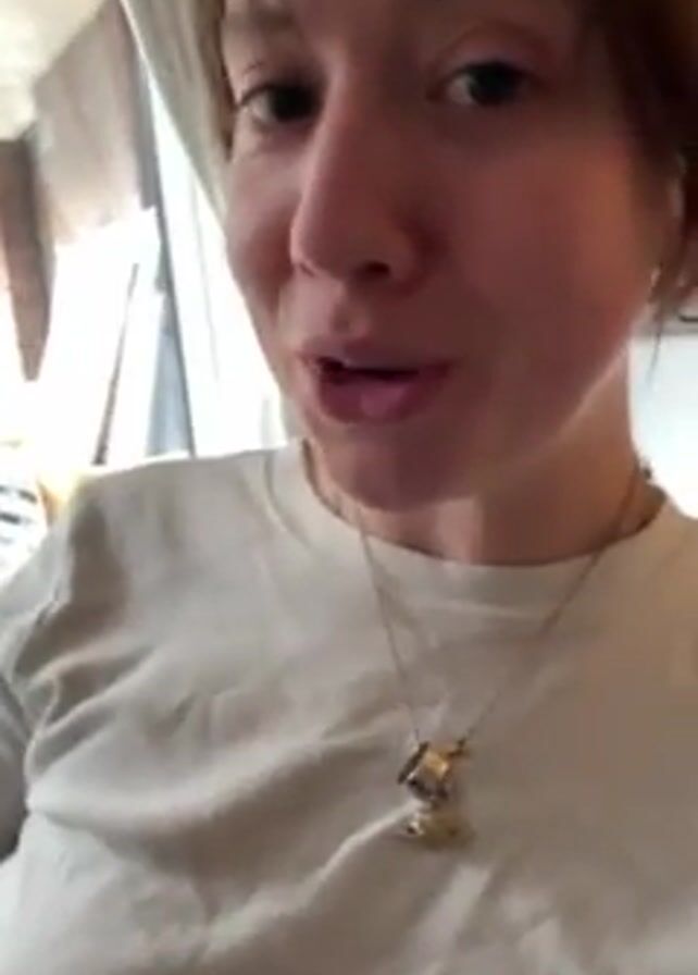 A person with short brown hair and wearing a white long-sleeved shirt with a pendant is speaking to the camera. They are sitting in what appears to be a living room with a window behind them, visible through which is a small outdoor space. A bottle of yellow liquid sits on the windowsill. The person is eating something. They move closer to the camera, stick out their tongue, and continue to speak. They mention "arugula salad, Diet Coke."