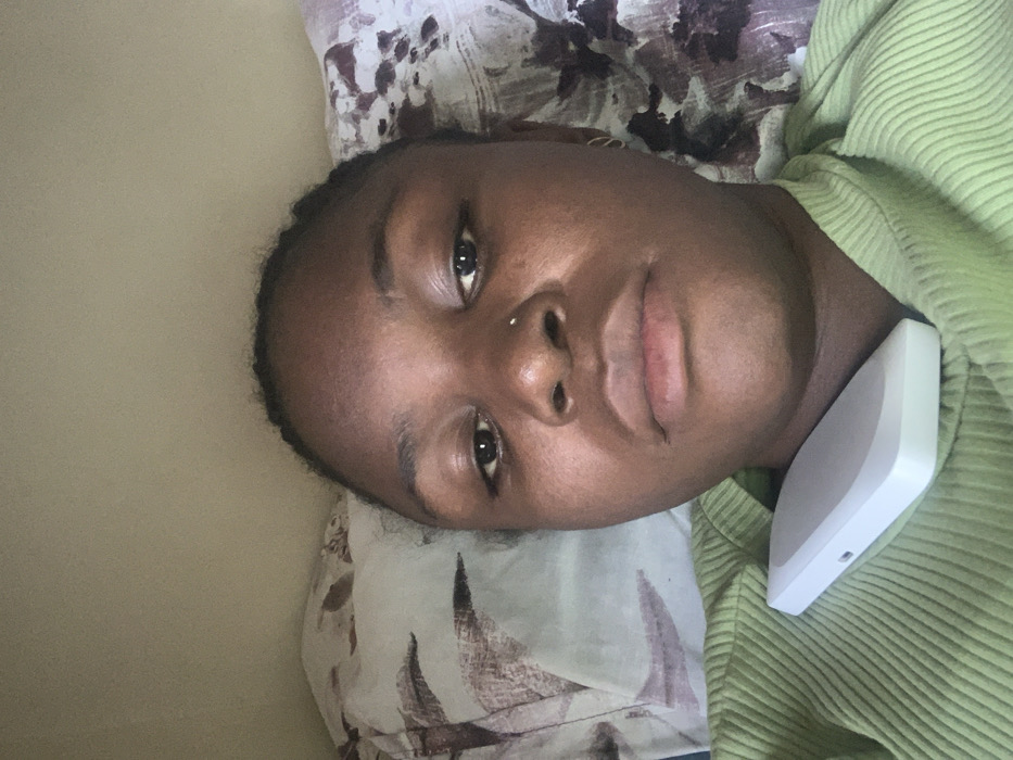 The image depicts a close-up portrait of a single individual, appearing to be a young adult female, positioned indoors. The specific location within Tempure, Nigeria, cannot be determined from the visual evidence. **People:** The subject is a dark-skinned individual with dark hair styled in braids close to the scalp. She has a small silver stud piercing in her left nostril and a circular earring visible in her right ear. Her eyes are open and directed forward, towards the camera. Her facial expression is neutral. **Objects:** She is wearing a light green, ribbed, long-sleeved garment, possibly a top or sweatshirt. Resting on her upper chest/collarbone area, over the garment, is a white, rectangular electronic device with rounded edges. The device has a small port, possibly a USB-C, and a minute indicator light on its visible side. Behind her head are two distinct patterned pillows; the one on the left features a pattern of brown, white, and pale blue/green shapes on a light background, while the one on the right has a similar but darker pattern, possibly with purple or maroon tones. The background behind the pillows is a plain, light-colored wall. **Actions/Interactions:** The individual is passively situated, directly facing the camera, suggesting a self-portrait or direct frontal photograph. The electronic device rests on her clothing without active manipulation. **Environment:** The setting is an indoor space, likely a bedroom or personal area, indicated by the presence of pillows and a plain wall. The lighting is soft and appears consistent with an indoor environment.