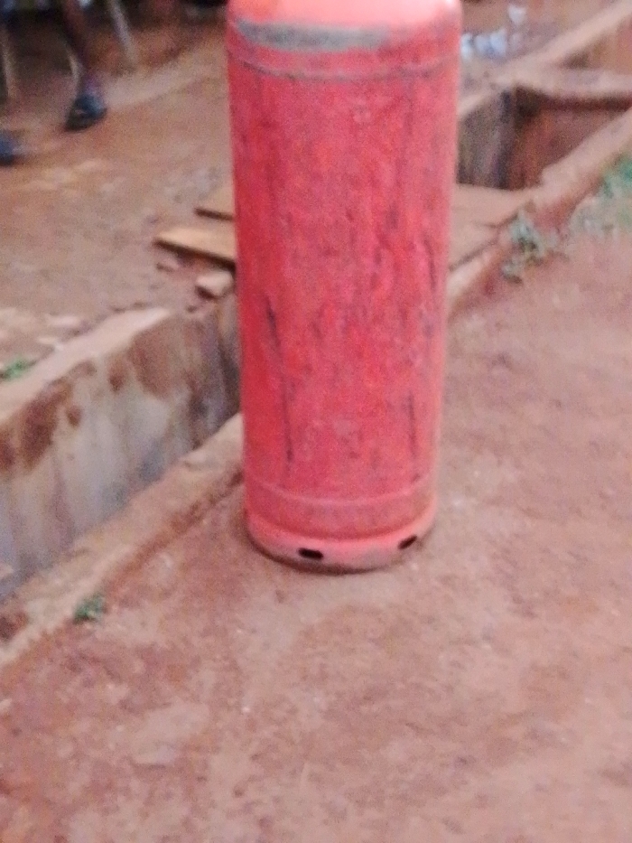 An outdoor scene in Ukwu-Abwa, Nigeria, features a reddish-orange LPG gas cylinder standing vertically on a reddish-brown, unpaved dirt surface