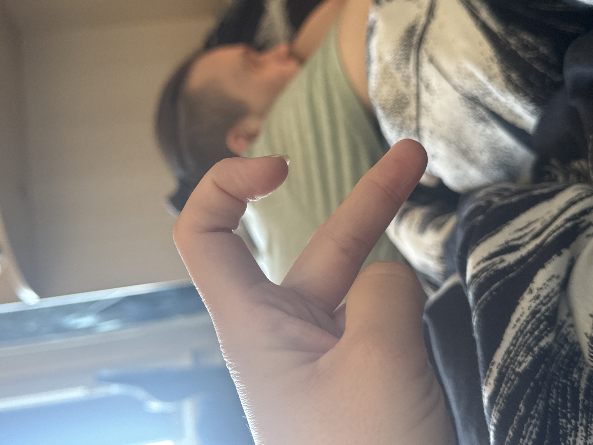 A close-up, upward-angled shot features a hand making a "peace" sign, with the index and middle fingers extended