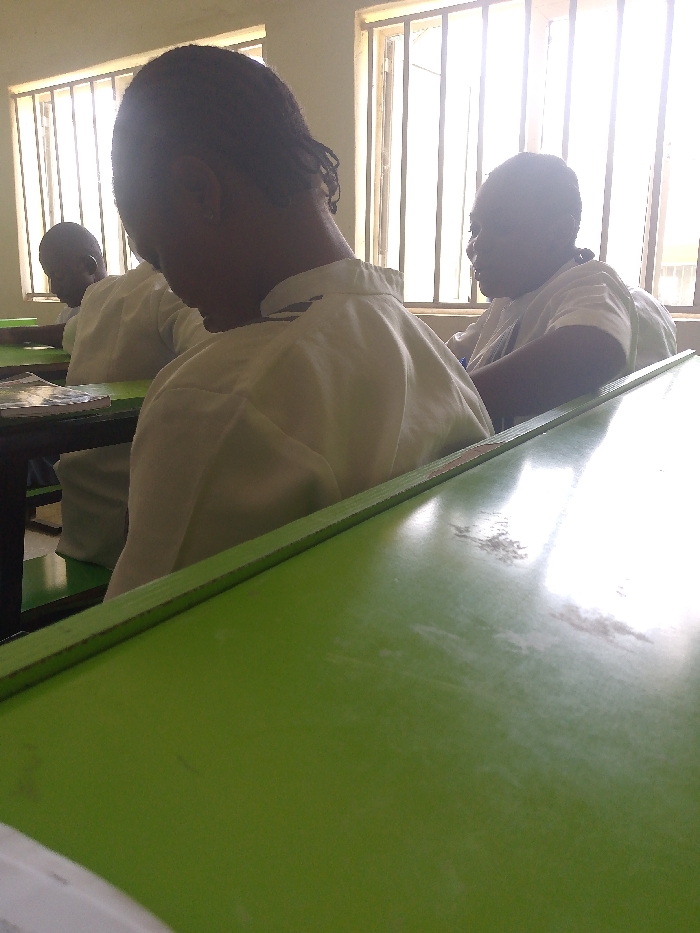 The image depicts an interior classroom scene in the city of Unknown, Unknown. Four individuals are visible, seated at desks. In the immediate foreground, a bright green desktop, exhibiting scuffs and reflections, occupies the lower portion of the frame. The back of a person, dressed in a light-colored garment, is partially visible in the bottom-left corner. The central figure is viewed from behind, wearing a light-colored collared shirt and dark hair styled in braids, leaning forward over a dark-framed desk with a green top. Behind and to the left of this central figure, another individual is partially observed from behind, similarly dressed in a light-colored shirt, seated at a desk with an open book on its surface. Further to the right, a fourth person is seated, appearing as a silhouette against multiple brightly lit windows, which are fitted with vertical metal security bars. This individual is turned, seemingly looking towards the left. Strong natural light floods the room from the windows, creating a backlighting effect.