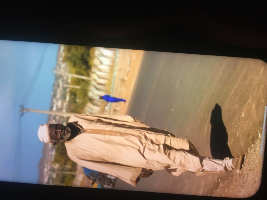 The image presents an outdoor scene captured as a photograph of a digital screen, likely in Bukuru, Nigeria. In the foreground, an elderly man with dark skin, a grey beard, and a slight smile is depicted in motion, walking towards the viewer on an unpaved shoulder adjacent to a paved road. He wears a light beige or tan long-sleeved garment, possibly a kaftan, with a patterned brown vertical trim down the chest, and a white cap on his head. His left foot is lifted mid-stride, and he wears light-colored sandals. He casts a distinct shadow to his left. In the mid-ground, a dark paved road extends diagonally, and a second, significantly blurred individual dressed entirely in a solid blue outfit stands or walks further down the road to the right. A dark-colored vehicle is partially visible on the left side of the road behind the foreground subject. Utility poles with overhead lines are present, and a low, light-colored barrier with a patterned top delineates the roadside from a vegetated embankment. The background features distant rolling hills with scattered vegetation and faint urban structures beneath a clear blue sky. The scene is brightly lit by natural sunlight.