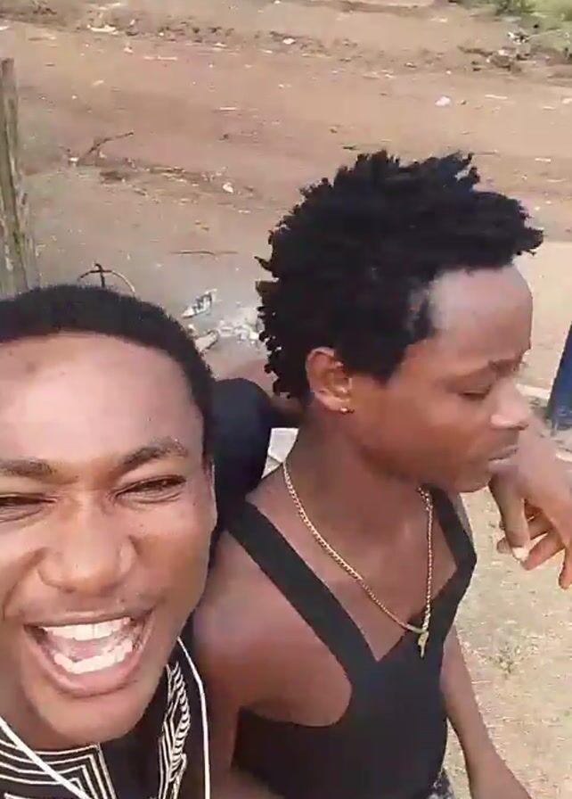 two young men posing and smiling for the camera outdoors. One man, wearing a black shirt with gold detailing and a white wire connected to headphones, is holding the camera. The second man is wearing a black tank top and a gold chain. At one point, the second man holds up a 100 Naira banknote. The environment appears to be a residential area with buildings and a dirt ground visible in the background. Other people walk by behind them at points.