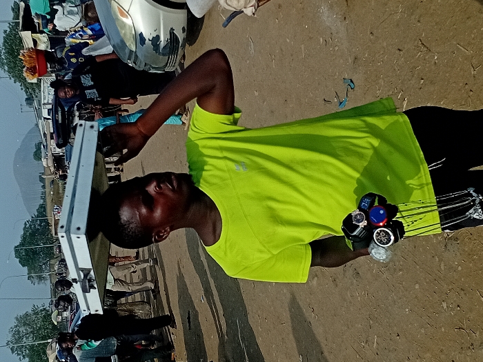 A man in a bright green shirt is holding a case over his head and has several watches on his hand. He appears to be walking on a street alongside parked cars and other people. In the distance, there is a mountain and trees. The ground is paved.