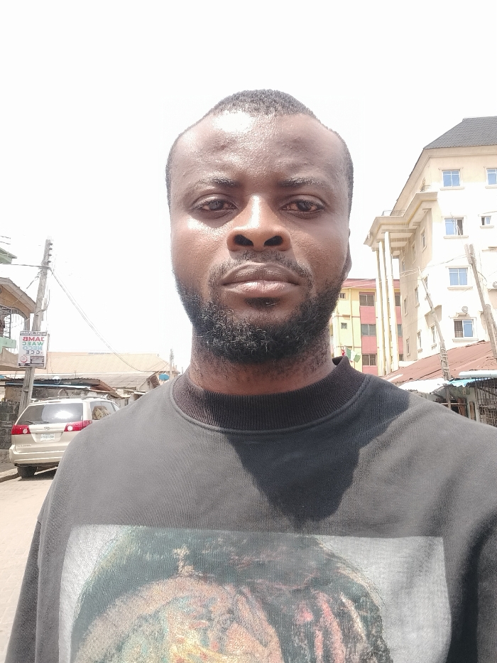 An adult male stands outdoors on a street in Alaiyabiagba, Nigeria, under bright, possibly hazy, daylight conditions