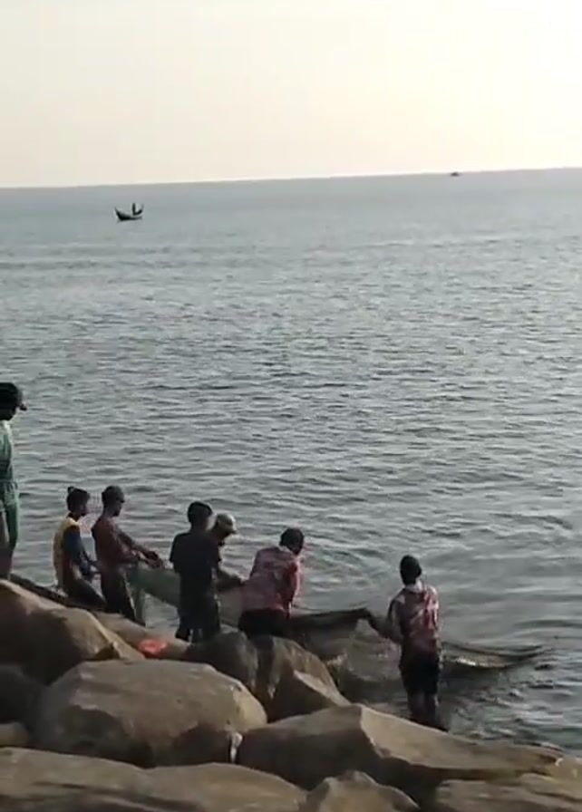 A group of about six people stand on rocks at the water's edge, pulling what appears to be a large fishing net from the ocean