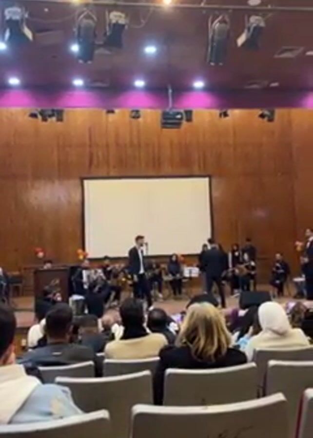 A full-shot, low-angle video shows a group of musicians performing on stage in a large auditorium. Two men stand center stage, dressed in suits, one appears to be singing. Surrounding them are musicians playing various instruments, including guitars and violins. A large blank projection screen stands behind the performers, illuminated by stage lights. The stage is set against a backdrop of dark wood paneling. Below the stage, an audience is seated in rows of grey auditorium chairs, some holding up phones to record the performance. The hall is lit with overhead lights, and some pink lighting from the stage casts a subtle hue across the ceiling.