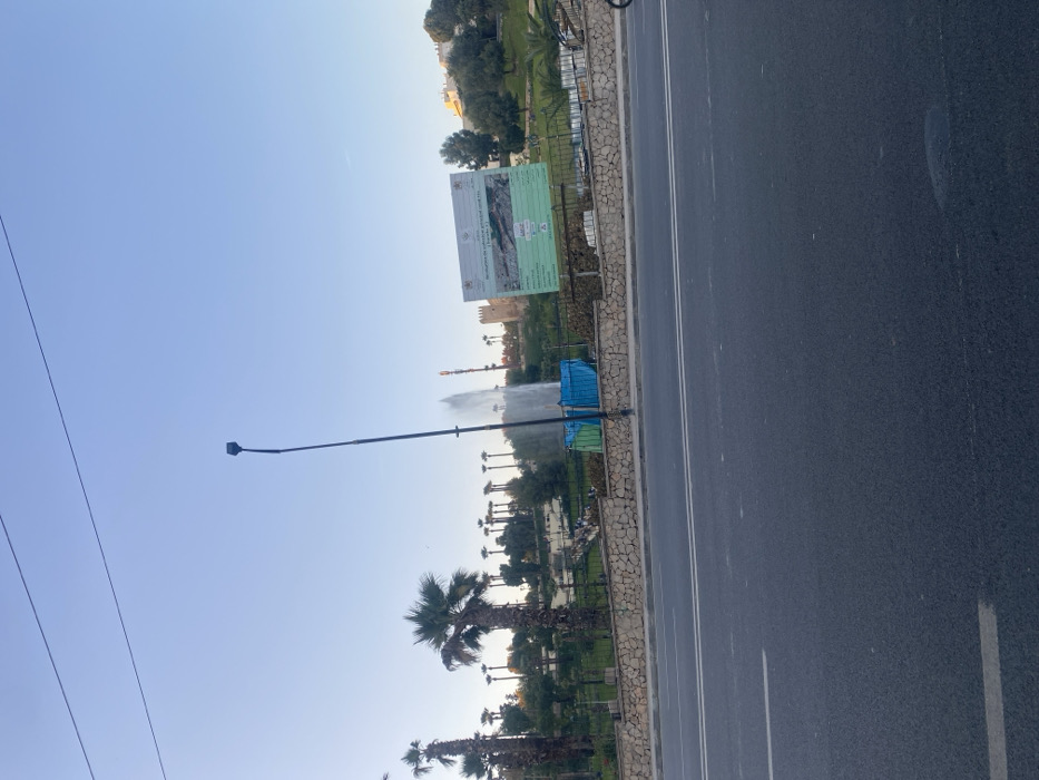 A roadside scene features a black asphalt road with painted white lines. Adjacent to the road is a stone embankment lining a grassy park area. Palm trees are visible in the park. A tall water fountain shoots up into the air. A large sign is posted near the park's edge. A street light pole is on the left. The sky above is clear and blue.