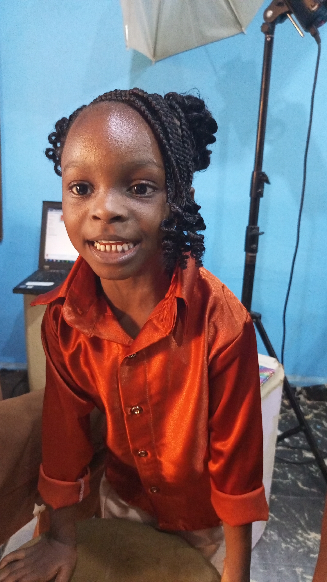 A young, dark-skinned person with braided hair and an orange, buttoned shirt is smiling. A laptop rests on a table to the left of the subject. Behind them is a blue wall, partially obscured by a photography light stand. The location is in Sabon Tasha, Nigeria.