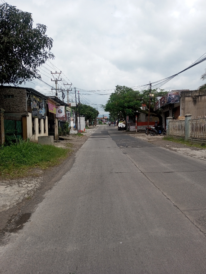 The image displays a street scene in Khajuripada, India, under an overcast sky. A two-lane asphalt road, exhibiting visible cracks and patched repairs, extends centrally into the distant mid-ground. On the left side of the road, a large tree with dark green foliage partially frames the upper left corner. Below it, a series of single to multi-story structures line the street. These buildings feature varied facades, including textured plaster and a green metal gate. Multiple commercial banners and signs, some depicting figures or text, are affixed to the building fronts. Utility poles constructed from wood or concrete support a dense network of black electrical and communication wires that crisscross the overhead space. The road's shoulder on this side consists of dry earth, gravel, and sporadic patches of green grass and weeds. On the right side, similar structures are present. One building features a dark banner on its upper facade, and a light-colored, ornate metal fence delineates a property line. A dark-colored motorcycle is parked on the shoulder near this fence. An indistinct individual is visible near the parked motorcycle. Further down the road, in the mid-ground, several smaller vehicles, primarily motorcycles, and a few human figures are discernable. The sky is uniformly overcast, contributing to diffused lighting.
