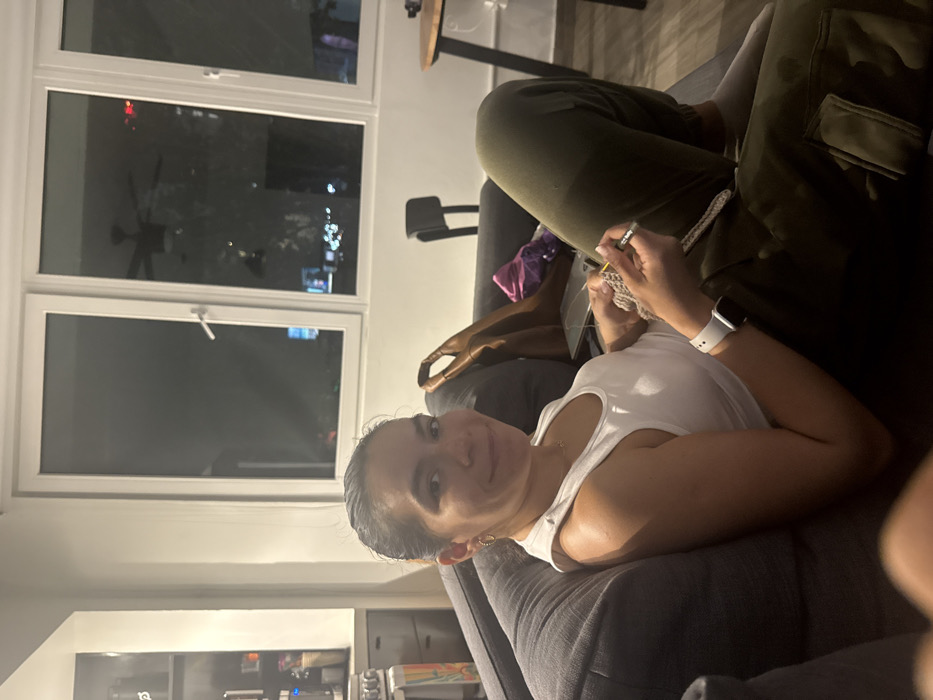 A woman in a white tank top rests on a gray sofa, holding knitting needles and yarn. Another person, dressed in olive green pants, is beside her. A large window illuminates the room, reflecting city lights. In the background, a small round table is visible. The woman faces the camera.