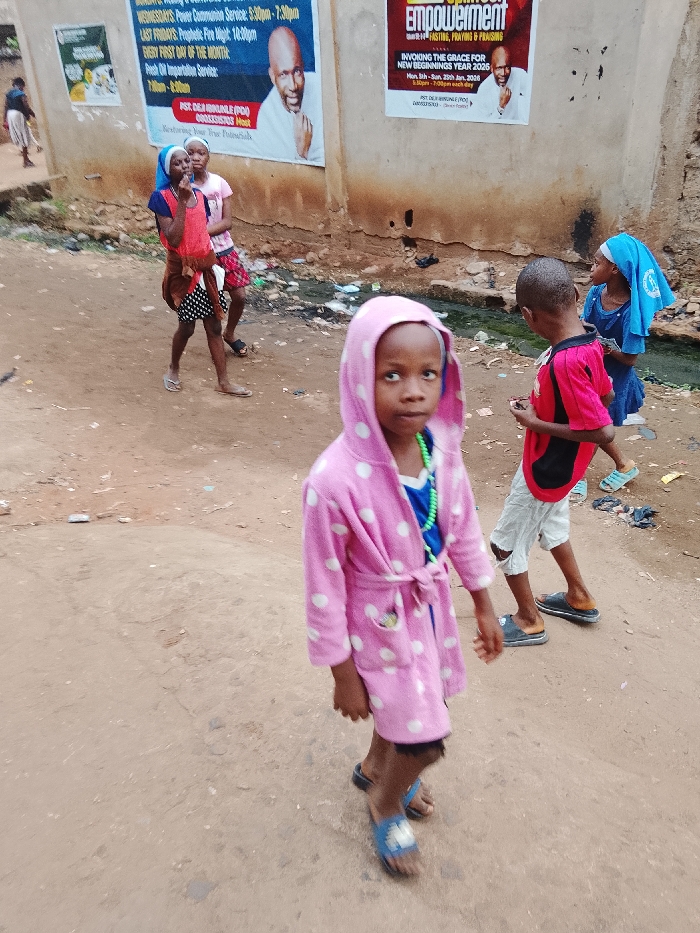 - "The image portrays a street scene in Onitsha, Nigeria, centered around several individuals, primarily children, on a dirt path alongside a weathered building wall" by FM-1G41I2, licensed under CC BY 4.0