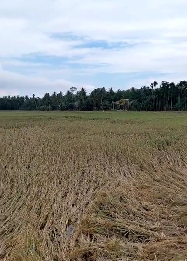 harvested rice field. The rice stalks are a golden brown color and appear to be flattened in some areas. In the background, there is a line of palm trees and other vegetation. The sky is overcast with patches of blue. There are power lines visible at one point.