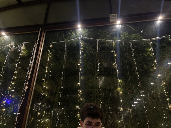 A dimly lit indoor space features a large window showcasing dense green foliage, likely a garden or outdoor area. Strands of decorative string lights are draped across the window. Below, a person with dark curly hair and glasses is visible. The room is dark with lighting provided by the string lights. The window frame is dark wood.